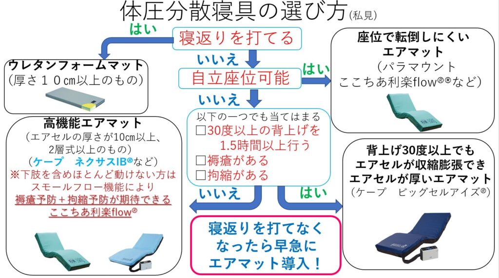 最後に、エアマット選びにはかなり抑えるポイントが多く、頭が整理しにくいと思いますので、今までの内容をふまえ、患者さんの状態ごとにどのようにエアマットの選べばよいかフローチャートを示します。