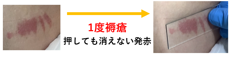 そのため、後述しますが、下肢の下にクッションを入れることで褥瘡発生しやすい腓骨に1度褥瘡(持続的発赤 下記参照)や踵の水疱など、褥瘡の発生がないかを定期的に確認することが大切になります。