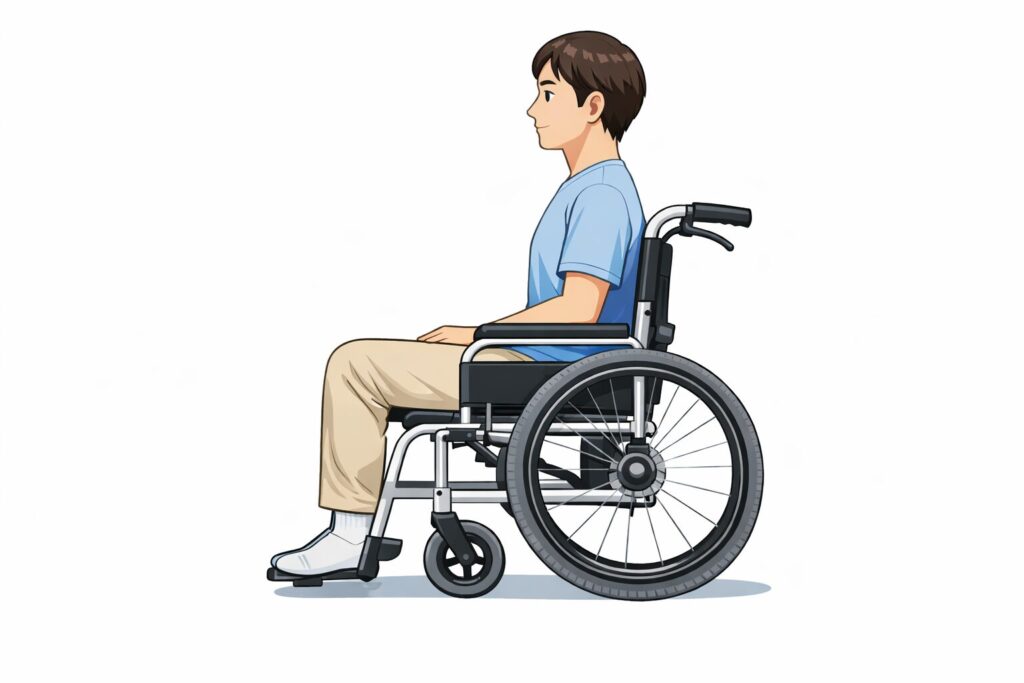 1 90度ルール:足をフットサポートにのせた状態で、股関節・膝関節・足関節が90度になるように車いすを調整する(90度は“目安”で、拘縮・疼痛・体幹バランスに合わせて調整。リハ職/福祉用具専門職の評価で“圧集中とずれを減らす座位”を優先)