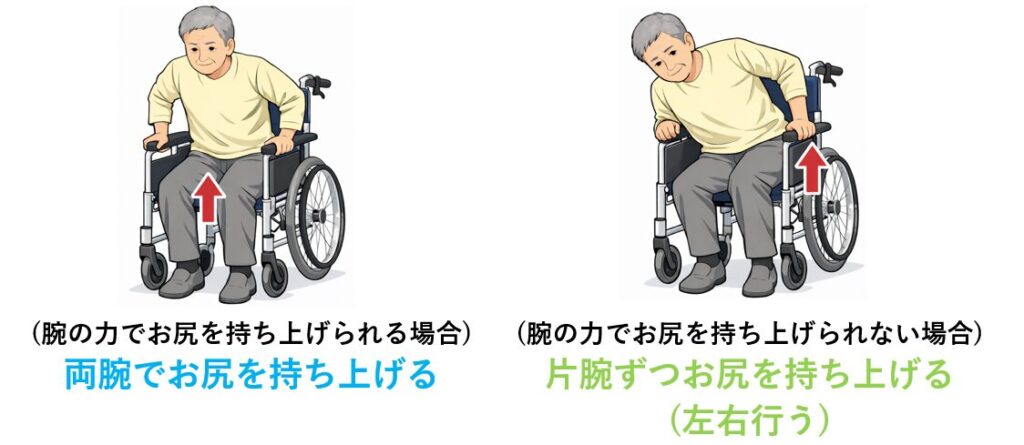 ②十分に力がない場合は片方ずつ臀部を浮かせる(イラスト右)