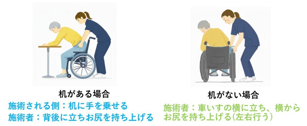 ①机に患者さんの腕を乗せてもらったうえで介助者が臀部を持ち上げる(イラスト左)