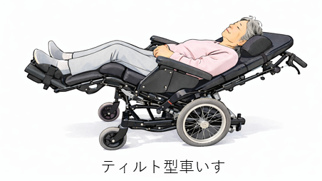 ティルト型車いすの背もたれを可能な限りフラットに近づくように傾ける(嚥下・呼吸・血圧・医療機器の状況に合わせて、安全に実施できる範囲で)