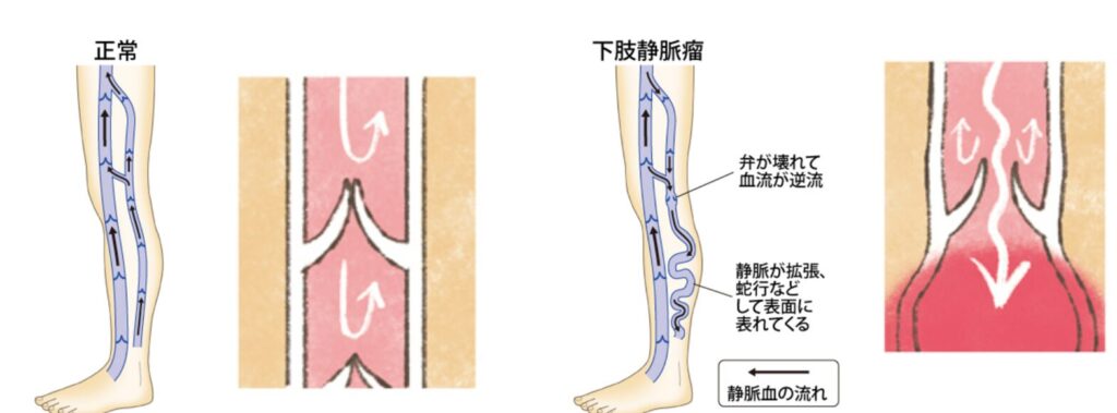 しかし、長時間の立ち仕事などで弁に負荷がかかり続けると、弁が破壊されてしまいます。すると、本来心臓に戻る静脈内の血液が逆流して下腿~足先に血液が貯留してしまうのです(上イラスト右側)。