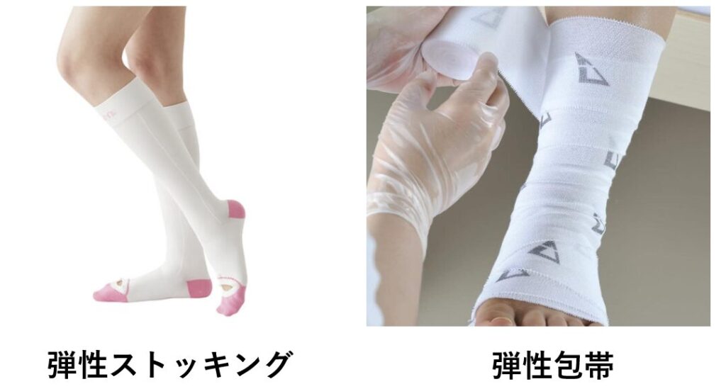 上の写真のように、圧迫療法には弾性ストッキングと弾性包帯による方法があります。